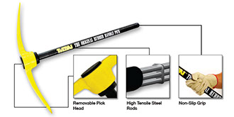 - A steel insert in the handle allows for easy removal and replacement of worn pick heads.